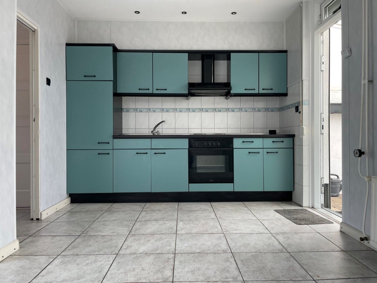 Open keuken (3,00 x 2,35 m) voorzien van tegelvloer en een nette opstelling met de volgende inbouw apparatuur: koelkast, oven, 4-pits elektrische kookplaat en afzuigkap. Alwaar deur naar de achtertuin.